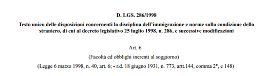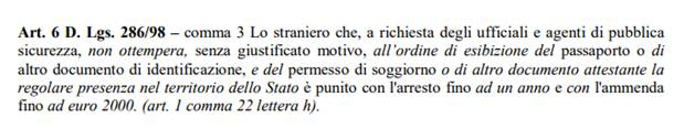 “在公共安全执法人员的要求下,外国人在无法给出合理解释的情况下,无法出示护照或其他可以证明身份的证件,并且无法出示居留证或其他可以证明其在意大利合法居住的证件,将被处以最高1年监禁,罚款最高2000欧元。”