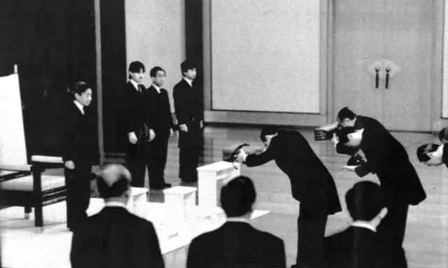 1989年1月7日,前任日本天皇裕仁在东京逝世,当时身为皇太子明仁(左一)即位。(传真照片,新华社发)