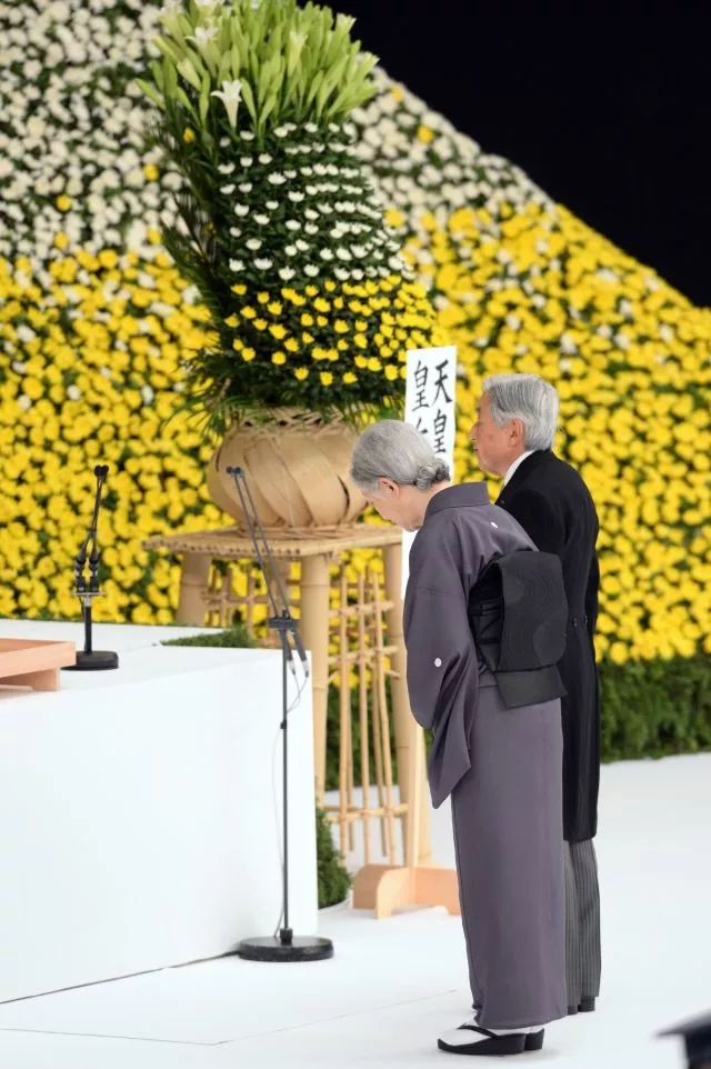 2015年8月15日,在日本东京武道馆,日本天皇明仁(左)和皇后美智子出席“全国战殁者追悼仪式”。(新华社记者马平摄)