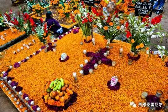 亡灵节守夜,墓园缀满花朵和蜡烛