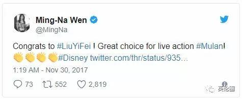 倒是好莱坞另一位华裔女演员、在1998年动画版《花木兰》中为木兰配音的温明娜,第一时间发推祝贺刘亦菲出演木兰。讲真这些曾经有希望出演木兰、最后没得到角色的女演员,可能反而不如粉丝们反应来的大呢……