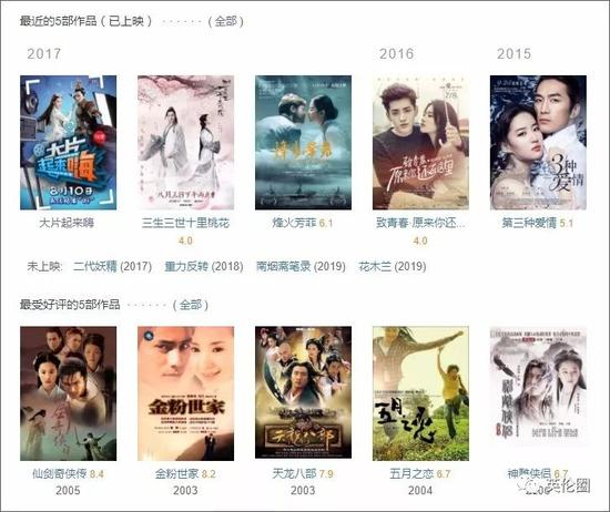不过从上面豆瓣电影页面的截图还是可以看到,“神仙姐姐”评分最高的几部作品,4部都是电视剧、3部都是古装片。