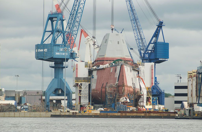 美国巴斯造船厂建造中的世界上最先进的朱姆沃尔特级驱逐舰,用的吊车上面也印着“SPMC”:上海港机股份制造(现被振华收购)。