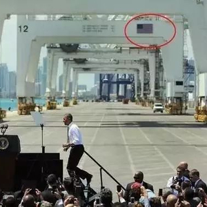 一股大风刮来,吹开美国国旗,露出了几个中国汉字,定睛一看,原来是中国上海振华重工的商标。