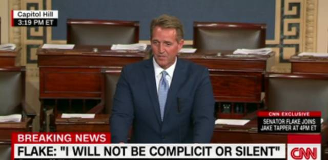 “I have children and grandchildren to answer to, and so, Mr President, I will not be complicit,” Flake said。