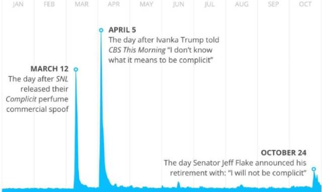 据Dictionary.com介绍,“complicit”在2017年总共出现了三次搜索高峰: