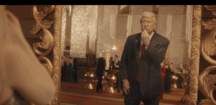 身着紧身连衣裙的“伊万卡”对着镜子打量自己,而映照在镜中的人却是她的父亲特朗普。