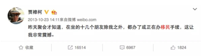 当年,著名导演贾樟柯就在微博上面感叹:“聚会才知道,再做的十几个朋友除我之外,都办了或者正在办移民手续,这让我非常震撼。”