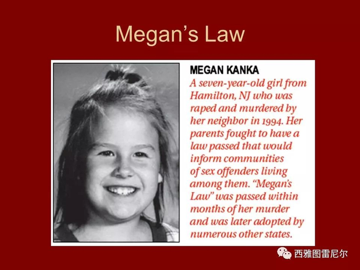 这一恐怖制度的建立是靠一名小女孩的生命换来的。1994年7月29日,美国新泽西州汉密尔顿镇的一个7岁小女孩,梅根(Megan Kanka)在家门口玩耍。邻居杰西过来对她说家里有一只小狗要给梅根看。杰西刚刚搬到此地,周围的人对他知之甚少。好奇的梅根跟着杰西来到他家。谁知,梅根一去不复返。杰西将梅根诱拐到家中后,残暴地强奸并杀害了她。