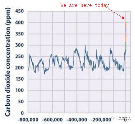 过去80万年内,二氧化碳浓度跟踪(数据来自https://www.ucsusa.org)