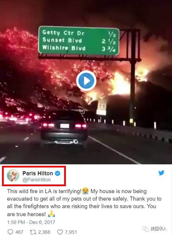 肆虐的野火甚至烧到了著名的比弗利山(Beverly Hills),诸多豪宅瞬间成为“火焰山”道具的一部分。好莱坞演艺明星们都纷纷在社交媒体上晒出自家附近的山火录像。比如酒店商业帝国希尔顿家的千金帕丽斯·希尔顿的推特成了这样:
