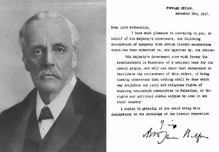 第一次世界大战之时的英国无比垂涎奥斯曼帝国统治之下的巴勒斯坦地区,为了攫取对这一地区的统治的合法性,时任外交大臣的贝尔福在犹太巨商罗斯柴尔德男爵的推动下发表了支持犹太复国主义的《贝尔福宣言》。▼