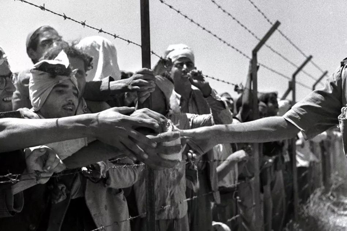 ▲ 1948年7月1日,巴勒斯坦拉马拉地区,第一次中东战争中被俘的阿盟战俘正在等待以色列守卫分发食物。