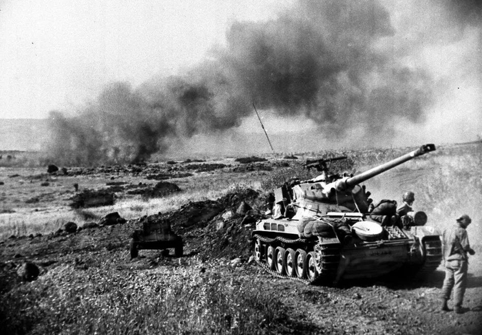 ▲ 1967年6月10日,第三次中东战争期间,以军的坦克与叙利亚军队激烈冲突,坦克身后的路上冒着炸弹爆炸后的浓烟。