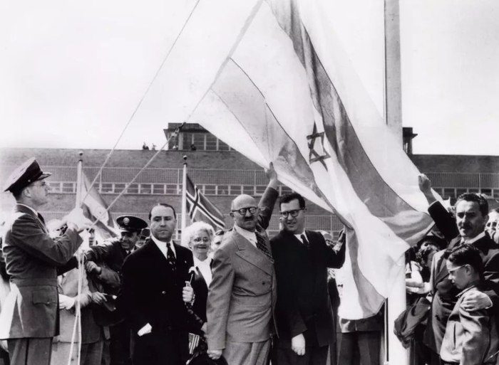▲ 1947年11月,以色列国会议员大卫·哈科恩(前左)与以色列外长阿巴·埃班(前右)举起以色列国旗,庆祝联合国投票通过犹太建国的决议。