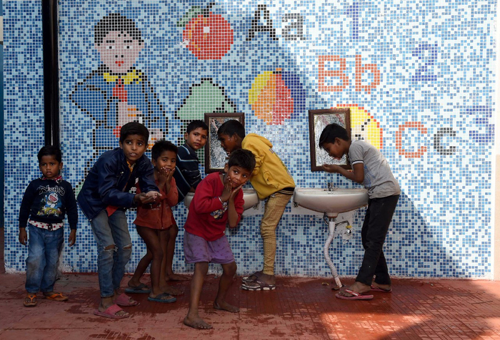 2017年11月26日,第一个专门为儿童设计的厕所在新德里普拉姆地区建成。厕所参照成人设计,共有15个坑位,分别为男孩和女孩设计了独立空间,并为身体有残疾是小孩设计了专用坑位。 (新华社记者张迺杰摄)