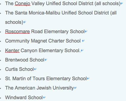 停课的学校中,包括加州大学洛杉矶分校(UCLA)。此外,寄宿学校Ojai Valley School的女生宿舍被烧毁,Thacher School的足球场也在几秒内被毁。现在学生都已经撤离至安全地带。