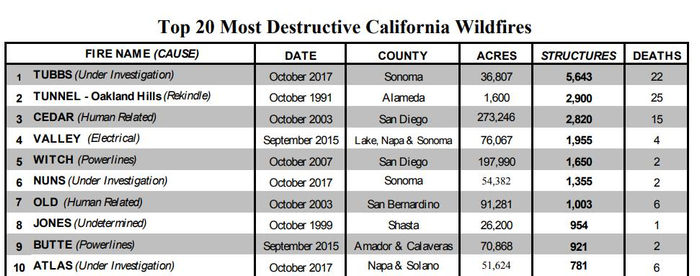 如图所示,加州史上最具毁灭性的十场大火中,五场都发生在近三年。