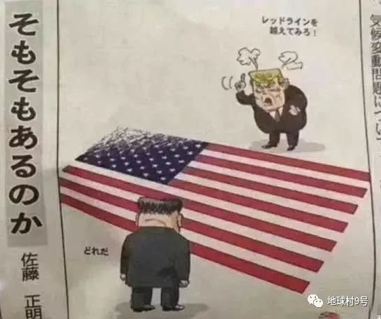 这是日本漫画。两位主角——特朗普和另一位年轻的领导人各站一边,中间是美国的星条旗。