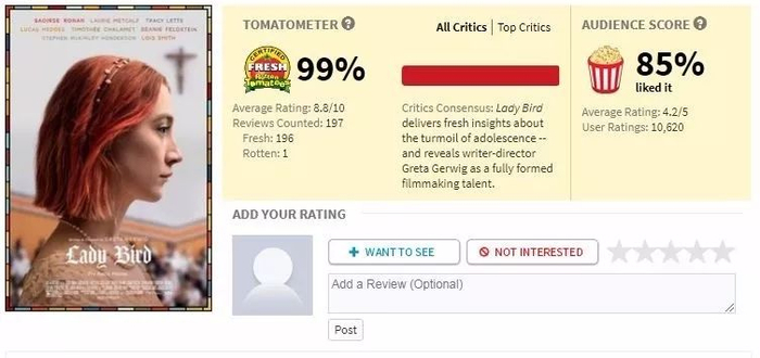 直到今天,《伯德小姐》在烂番茄上终于出现了三个多月以来的第一个烂评,连续好评纪录也停留在了196,尽管没有突破200连续好评令人感到些许遗憾,但之前的196:0也成为了自烂番茄网站建立以来的绝对第一。