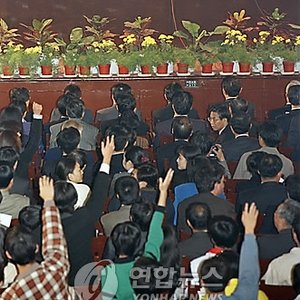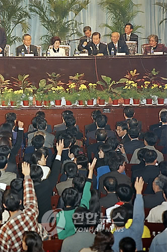 (资料图片:2003年7月9日,在清华大学,时任韩国总统卢武铉在演讲后接受学生提问。韩联社)