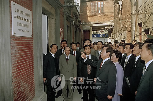 (资料图片:1994年3月26日,在上海韩国临时政府旧址,金泳三追思抗日独立运动先贤。韩联社)