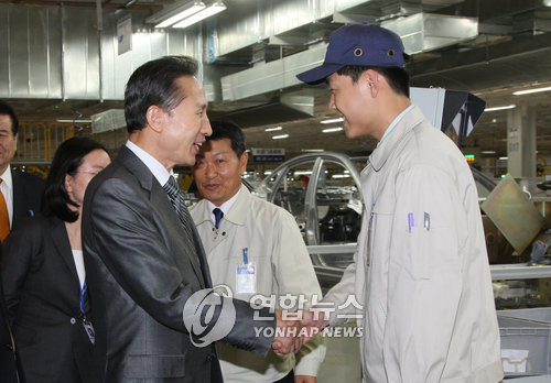 (资料图片:2008年5月29日,在北京现代汽车工厂,李明博与一位员工握手。韩联社)
