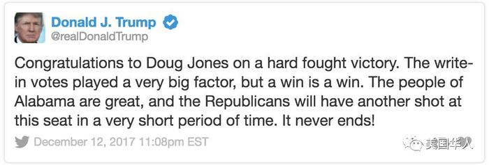 尽管12日晚,摩尔不承认败选,要求重新点票(不过法律规定,赢率超过0.5%就不能要求重新点票)。但川普总统和阿拉巴马共和党已经承认琼斯胜选。川普在第一时间送达对琼斯的祝贺:“不折不扣的一场胜利(A win is a win)!“