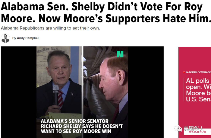 阿拉巴马共和党参议员Richard Shelby则说:“我不能选 Roy Moore,不希望看到Moore赢得周二的选举。” 值得一提的是,Shelby议员最早于1986年以民主党注册身份当选,后来,他变到共和党。从此,阿拉巴马州参议员竞争历史中没有出现过任何一位成功当选的民主党人。直到昨天。