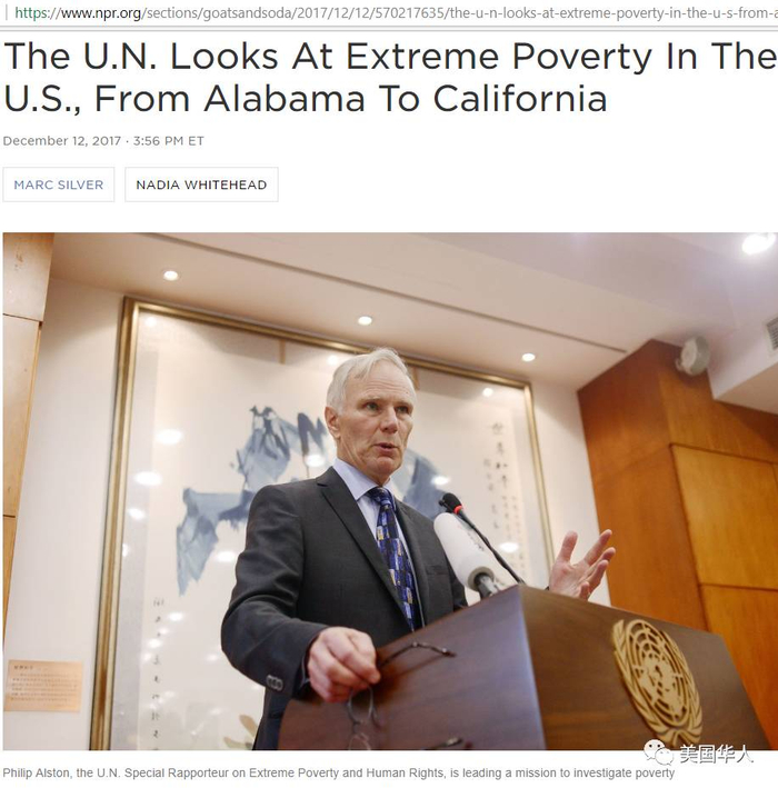 纽约大学法学教授Philip Alston领导联合国贫民人权调查组,图片来源NPR报道