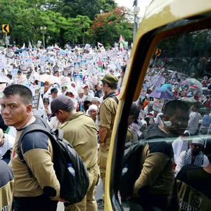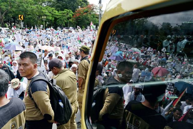 12月10日,抗议示威人群聚集在印度尼西亚雅加达的美国驻印尼大使馆外。美国总统特朗普6日宣布承认耶路撒冷为以色列首都,此举遭到国际社会普遍反对,多国相继发生持续抗议示威活动。图/新华