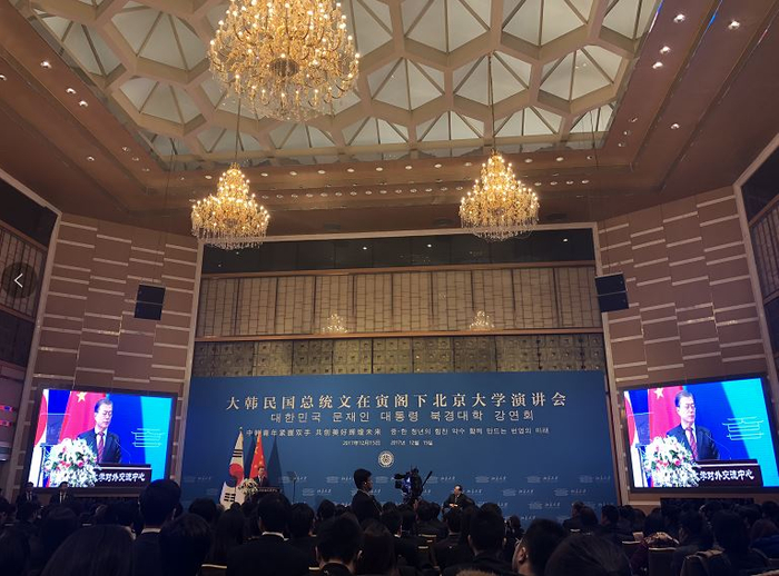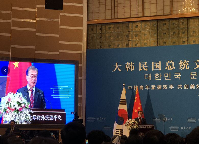 12月15日上午,正在中国访问的韩国总统文在寅在北京大学发表了题为“中韩青年紧握双手,共创美好辉煌未来”的主题演讲,文在寅回顾了中国与朝鲜半岛相互影响和合作的悠久历史,说“韩国人每天都在接受着中国文化”,并希望中韩在安全领域强化合作,共同解决目前的东北亚危机。