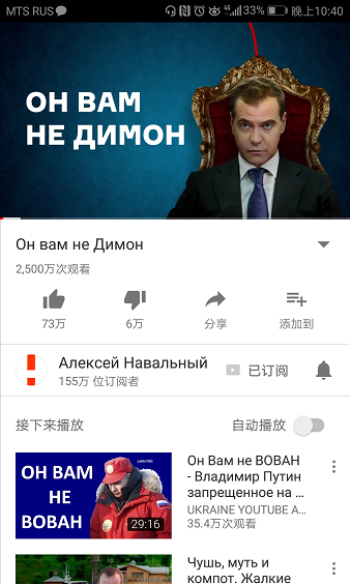 其实,梅德韦杰夫一早就宣布不会参选总统,很大一部分原因便是因为他的名誉着实被纳瓦利内搞脏了。自从3月份纳瓦利内在Youtube上传了揭露小梅豪华别墅拉风游艇之类的视频后,网上便蔓延开各种各样黑化、恶搞梅德韦杰夫的视频,并且这类视频的点赞数都非常之高。而有关小梅的正常新闻视频,点赞数不高,“踩”数却很高。(除了纳瓦利内给小梅的致命一击,前莫斯科市长卢日科夫新出版的回忆录中爆料说,他当年被撤职是因为不支持梅德韦杰夫参加2012年总统大选,并揭露了小梅与寡头的一些勾结,这让小梅本已严重受损的名声再次涂黑)。