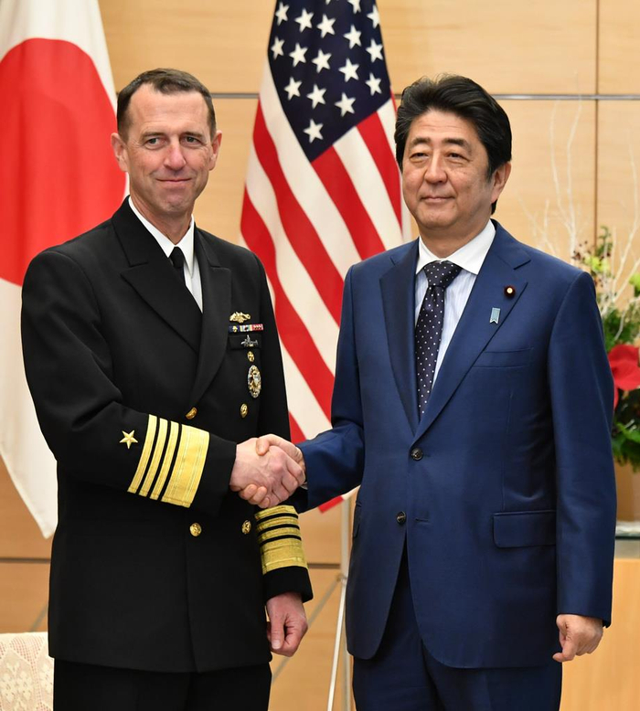 下午2点32分,安倍在首相官邸会见了美国海军作战部长理查德森。安倍表示,日本海上自卫队和美国海军的合作是日美军事同盟支柱,为应对朝鲜导弹威胁,必须进一步加强合作。理查德森也表示,本次访日目的是巩固美日同盟基础。