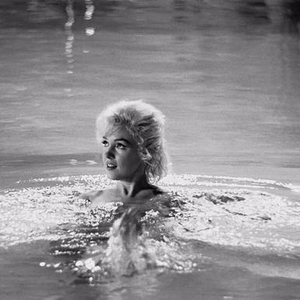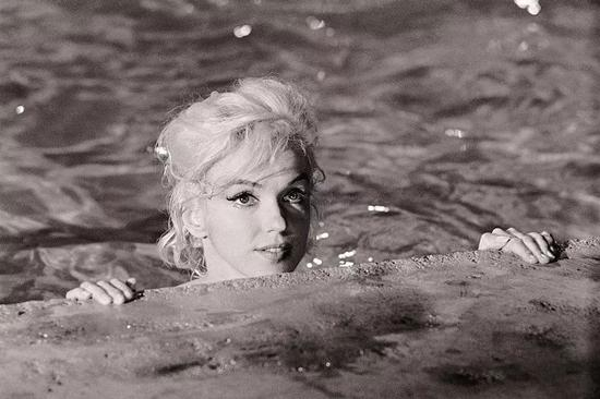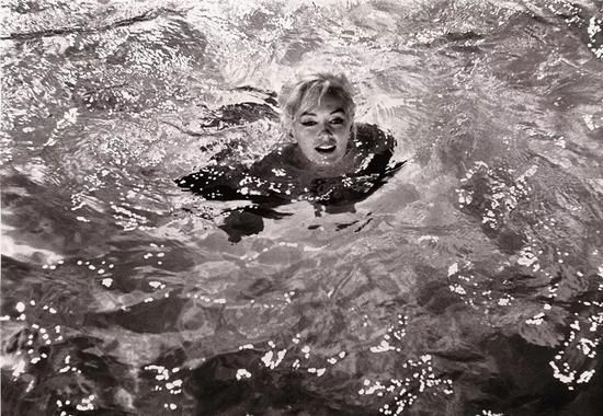 后来,她向泳池边缘游去,脑袋和肩膀露出水面,眼睛不时瞥向池岸。等她终于笑完了,便抬起右腿,压在游泳池边缘,身体的其余部分仍然看不见——在梦露重新游向池中央之前,摄影师席勒迅速地连按几下相机快门按钮。