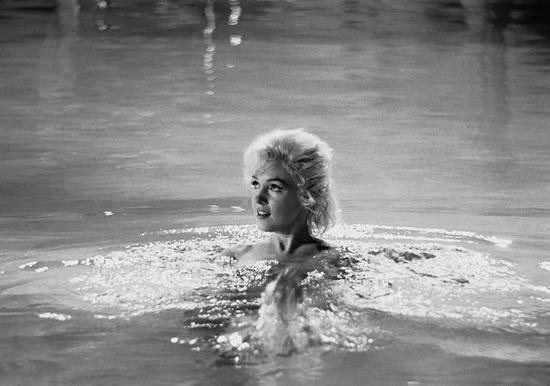 梦露跳进游泳池,她先是在水里狗刨式游了一会儿,又仰面躺着漂浮了一会儿,由于水温在32摄氏度左右,人在里面感觉像是洗着温水浴。这场戏一句对白也没有,只有人的笑声在回荡。