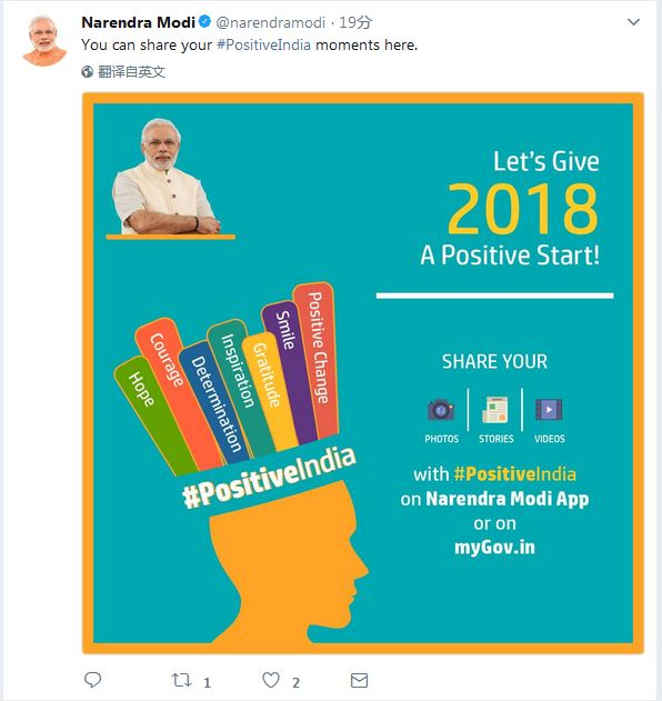 莫迪还在推特中发布了一张海报,鼓励印度网友在以莫迪本人命名的政务APP上分享2017精彩时刻,并鼓励民众,应该将”正能量”带入新的一年。