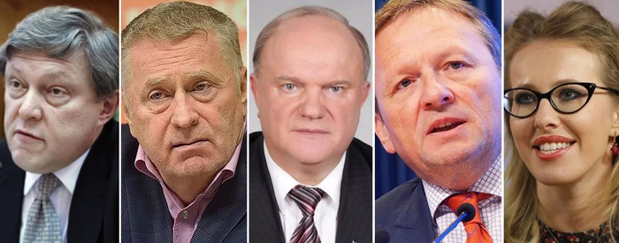 例如:俄罗斯“亚博卢”党创始人之一亚夫林斯基,俄罗斯自由民主党领导人日里诺夫斯基,俄罗斯共产党领导人久加诺夫;另外,俄罗斯增长党已决定推举该党主席、俄总统保护企业家权利全权代表鲍里斯·季托夫,记者和电视主持人克谢尼娅·索布恰克也准备参选。(☟下图从左至右顺序)