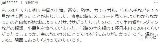 30年前,我曾去中国上海、西安、敦煌、喀什、乌鲁木齐等转了1个多月。因为看不懂菜单、吃不惯有些地方干巴巴的米饭,经常点牛肉面和拉条子等面类,还有小笼包。当时牛肉面一碗好像相当于20日元左右,对没钱的我来说,真的很难得。好怀念啊。如果关西地区有,很想去。