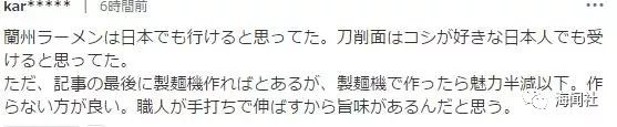 我以前就觉得兰州拉面能在日本卖。刀削面也会让一些喜欢劲道的日本人接受。但是文中记者说希望有做兰州拉面的机器,要是用机器做会让它失去一大半魅力。还是别做机器了。我觉得只有师傅手工做的才香。