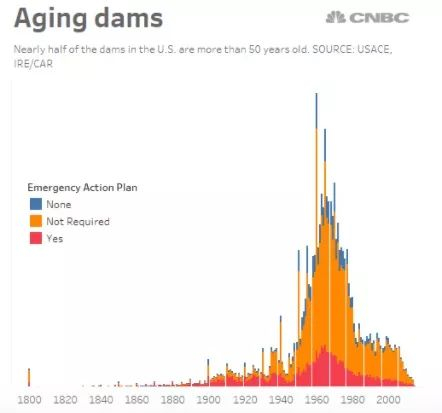 据ASCE统计,全国9万多座水坝的平均年龄高达56岁,不安全的水坝数量增长速度远高于修复速度。