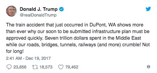 “刚刚发生的火车事故比以往任何时候都更能说明,为什么即将提交的基础设施计划必须迅速得到批准。当我们在中东花费了7万亿美元的同时,我们的道路、桥梁、隧道、铁路等却在崩溃,不能再这样了!”
