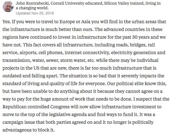是。如果你去欧洲或亚洲旅行,你会发现在城市地区,那里的基础设施比我们的要好得多。过去30年里,这些地区较发达的国家一直在进行基础设施投资,而我们没有。这一事实涵盖了所有的基础设施,包括道路、桥梁、铁路服务、机场、手机、互联网、发电和输电、水、下水道、雨水等等。而在美国,可能个别项目是新的,太多的基础设施已经过时并且分崩离析。这一状况严重影响到每个人的生活水平和质量。我们的政治精英们知道这一点,但却一直无能为力,因为在该如何支付这些需要完成的大量工作上,他们无法达成一致。我怀疑共和党控制的国会现在将允许基础设施投资移动到立法议程的顶端,并设法为其提供资金。这是一个两党在竞选时都承认的问题,阻止它在政治上是不利的。