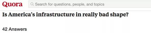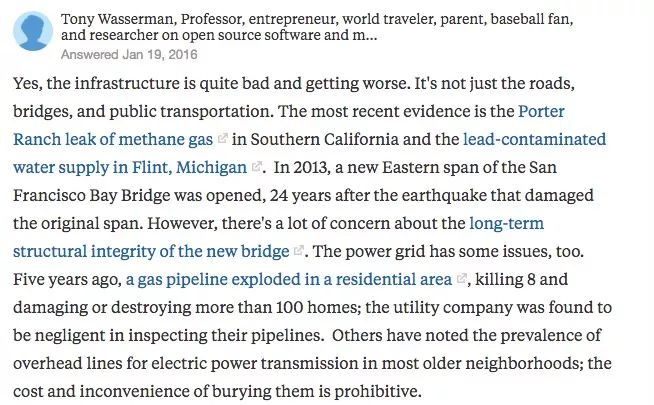 是的,基础设施非常糟糕,越来越糟。不仅仅是道路,桥梁和公共交通。最近的证据是加利福尼亚州南部的沼气泄漏事故和密歇根的水源铅污染事故。2013年,旧金山湾跨海大桥东部的一段新建桥梁开通,24年前,地震曾损坏了原有桥梁。然而,新桥结构的长期稳定性令人担忧。电网系统也有一些问题。五年前,一条天然气管道在住宅区爆炸,造成8人死亡,100多座房屋损毁,公用事业公司后被发现疏于检查他们的管道。此外,在大多数较老的街区,架空电缆普遍存在,因为掩埋它们的成本和不便令人望而却步。