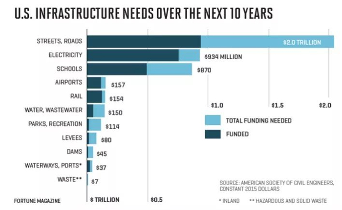 在今后的十年,美国基础设施建设和修复仍将长期面临资金不足的困境。其中,道路建设需要2万亿元,电力设施需要9.34亿美元,学校建设需要8.7亿美元。