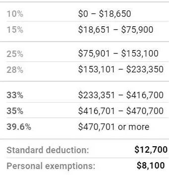 7级税率 (10%, 15%, 25%, 28%, 33%, 35%, 39.6%)个人税级: