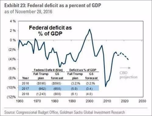 首先,新税改会直接造成财政赤字,加大财政悬崖风险。根据高盛预计,在税改政策下,美国2017年财政赤字占GDP的比率将从2016年的3.2%飙升至5%,到2018年将增加到6.1%。▼