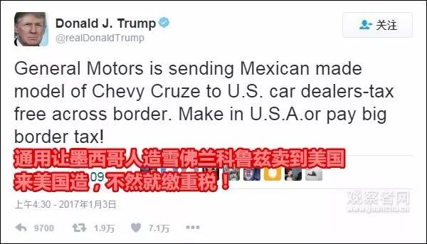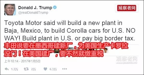“把工作重新带回美国”是特朗普在竞选中向选民做出的承诺。上任后,特朗普即开始试图努力兑现:发文抨击日本汽车厂商丰田在墨西哥建厂,生产卡罗拉卖到美国;“炮轰”通用汽车在墨西哥生产雪佛兰汽车并卖给美国;威胁福特、陶氏化学、洛克西马丁等美制造业企业留在美国等等,不一而足。但是,除了表态以外,这些企业并没有进一步的行动。▼
