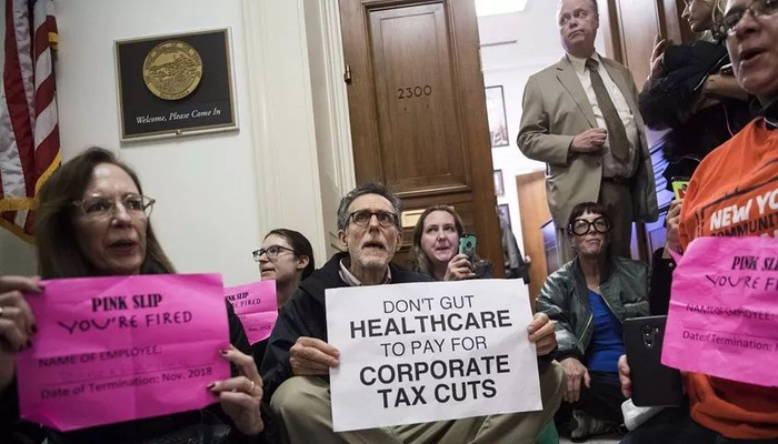 ▲ 12月5日,美国华盛顿,民众聚集在国会议员办公室外抗议共和党税改法案。