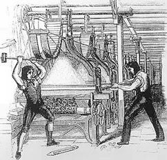 △ 第一次工业革命时期,机器生产逐渐淘汰手工劳动,使大批手工业者破产、失业、工资下跌,当时的工人们把机器视为贫困的根源,用捣毁机器的方式向企业主抗议。这场运动的首领叫卢德,故名卢德运动